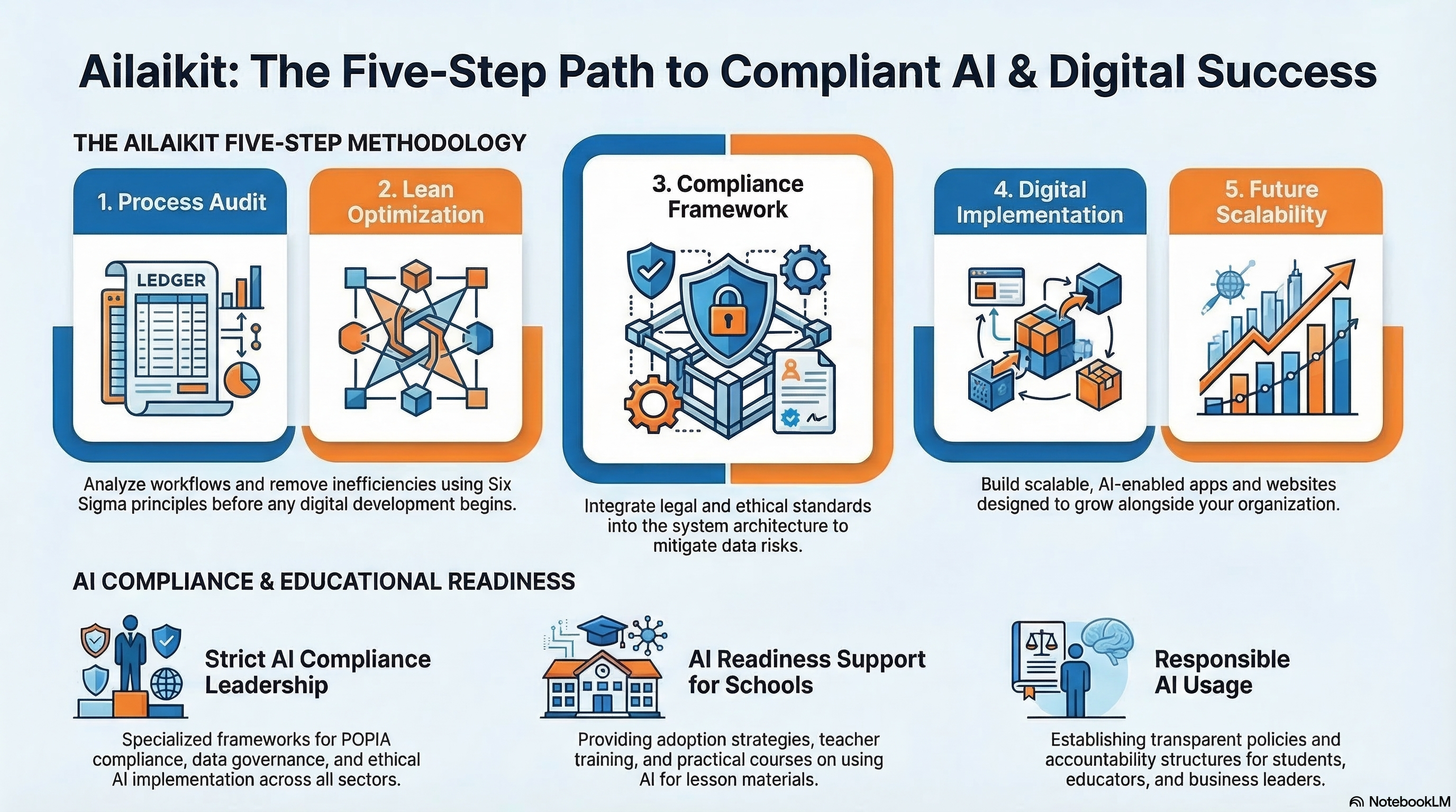 By combining process engineering, AI expertise, compliance leadership, and practical implementation, Ailaikit enables businesses and schools to adopt technology with confidence and long-term success.
